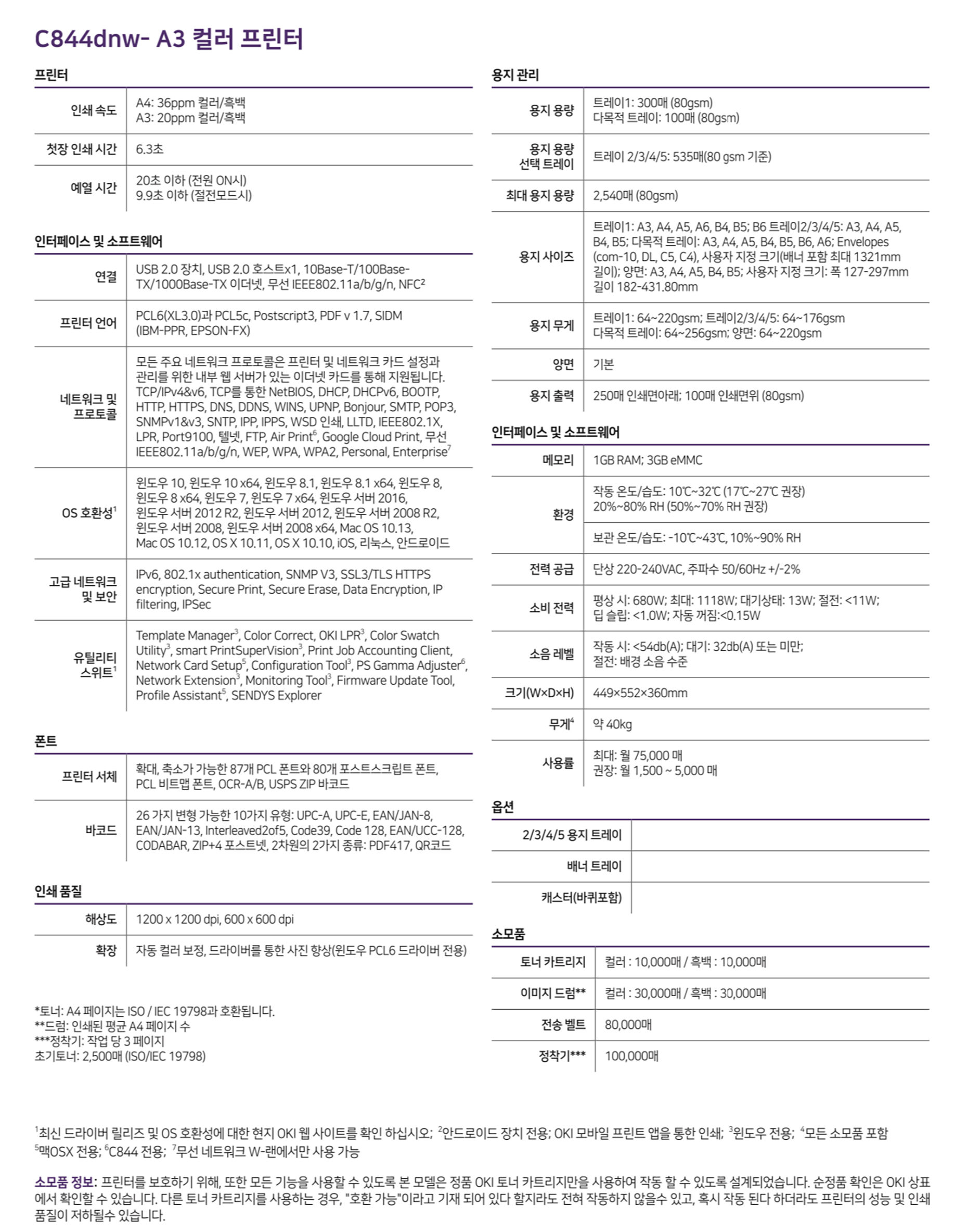 | 인쇄 속도 | A4(가로): 컬러: 36 ppm, 흑백: 36 ppm A3 컬러: 20 ppm, 흑백 20 ppm |
